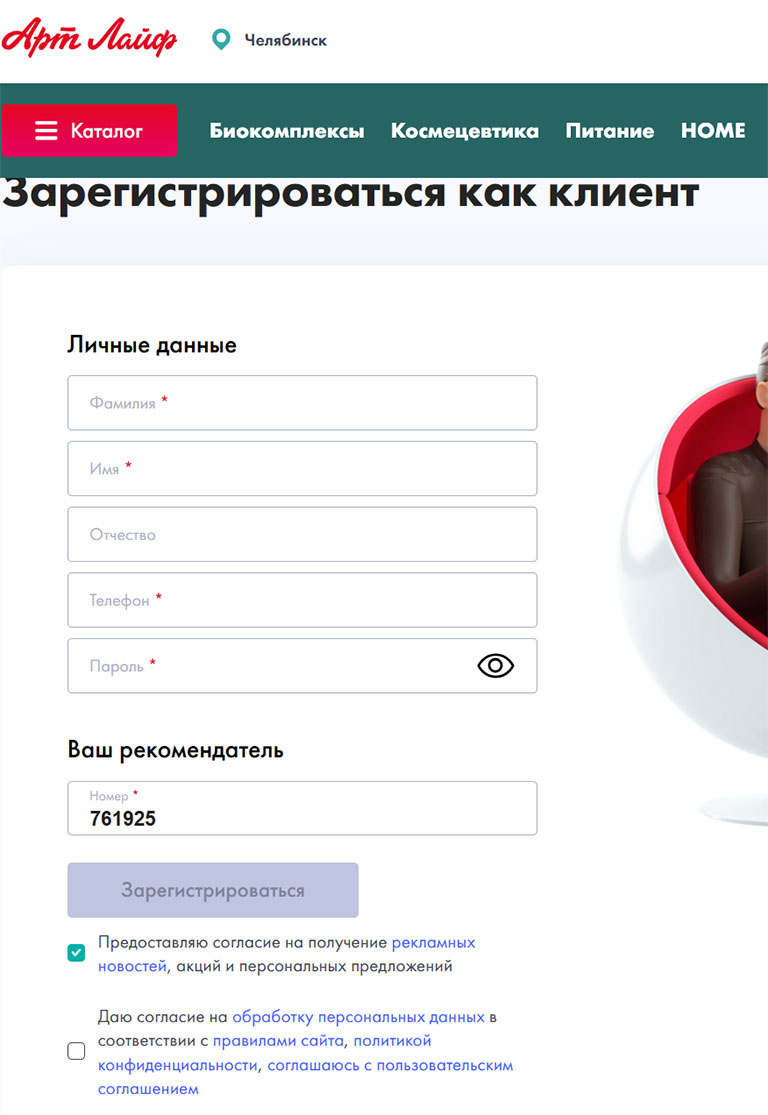 1. Необходимо перейти на сайт официального интернет-магазина Артлайф и пройти там процедуру регистрации.