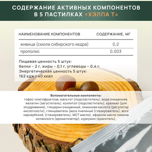 Формула «Хэлпа Т» разработана на основе целебных свойств живицы кедра сибирского и прополиса. Обладает выраженным антимикробным, заживляющим, антиоксидантным действием.